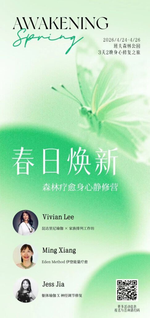 你知道吗?你的身体可能比头脑更加诚实。那些睡不着的夜晚、紧绷的肩颈、莫名的疲惫感——都是身体在试图告诉你:是时候停下来,让自己休息一下了。真正身心修复,并不只是躺下。而是重新体验到:你是安全的,你做的足够了。当你感受由内而外的平静,你将遇见一个更加平衡与丰盈的自己。 这个四月,在班夫的静谧森林中,三位身心导师 Vivian,Ming…